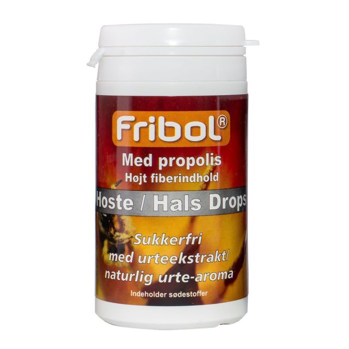 Fribol Hoste/Hals Propolis lindrer effektivt i halsen ved forkjølelse og ellers ved vond og sår hals. Virker lett slimløsende ved forkjølelse, svakt hostedempende og lindrer irriterende hoste. Dropsene gir en frisk følelse i nesen dersom det tetter seg til. Basert på råvarer som er kjent for sine forfriskende og lindrende egenskaper. Fribol Hoste/Hals drops er sukkerfrie, glutenfrie, laktosefrie og rike på kostfiber. Inneholder ikke azofargestoffer. Søtet med sukralose som ikke er skadelig for tennene. Kan spises av diabetikere, glutenintolerante, gravide og andre som ønsker et alternativ uten sukker.