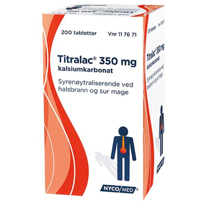 Titralac tabletter er et reseptfritt legemiddel som inneholder virkestoffet kalsiumkarbonat. Titralac virker syrenøytraliserende og brukes til voksne over 18 år ved for mye magesyre, magesår, halsbrann og sure oppstøt. Har raskt innsettende og relativt langvarig virkning. Dosering: Voksne over 18 år: Normaldosering ved for mye syre eller halsbrann: 1-2 tabletter ved behov, høyst 20 tabletter daglig. Normaldosering ved magesår: 2 tabletter 1 time og 3 timer etter måltid samt dobbelt dose ved sengetid. Annen dose etter avtale med lege. Tablettene bør tygges (de kleber ikke til tennene). Kan også oppløses i munnen eller svelges hele med væske. Annen informasjon: Skal ikke brukes ved overfølsomhet for innholdsstoffene, nedsatt nyrefunksjon, gastrointestinale blødninger, sykdommer og/eller tilstander som leder til hyperkalsemi og/eller hyperkalsiuri. Ved langvarige symptomer bør tilstanden undersøkes av lege. Les pakningsvedlegget før bruk. Der finner du blant annet informasjon om hvordan du bruker dette legemidlet, forsiktighetsregler og råd for gravide og ammende.