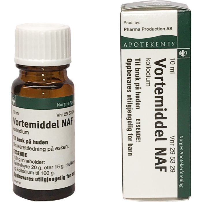 Vortemiddel NAF er et reseptfritt legemiddel til fjerning av vorter. Det inneholder salisylsyre som virker oppløsende på hudens hornlag, og melkesyre som virker etsende. Kollodium gjør at det dannes en vannavstøtende film som hindrer fordamping og gir en økt og forlenget effekt av de aktive stoffene. Bruksrettledning: Til voksne og barn over seks år. Bløtgjør huden i lunkent vann før påføring. Vorten pensles i tynt lag hver kveld. Løs hud og tidligere pensling på vortens overflate skrapes vekk med bad og filing cirka to ganger i uken. Gjenta behandlingen daglig i 4-6 uker eller til ønsket resultat.