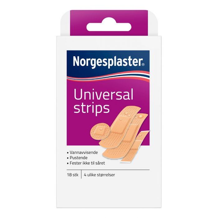 Norgesplaster universalstrips er ferdige strips i 4 forskjellige størrelser. Hudvennlig og god klebekraft. Sårputen fester seg ikke i såret. Vannavstøtende og pustende.