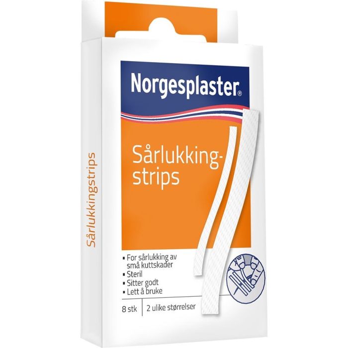 Norgesplaster sårlukkingsstrips er sterile hvite strips laget av non-woven materiale med allergitestet polyakrylatlim, til sårlukking av små kuttskader. Enkle å bruke og sitter godt på. Pakken inneholder 8 stk. i to størrelser: 5 stk. à 3 mm x 7,5 cm 3 stk. 6,4 mm x 8,0 cm
